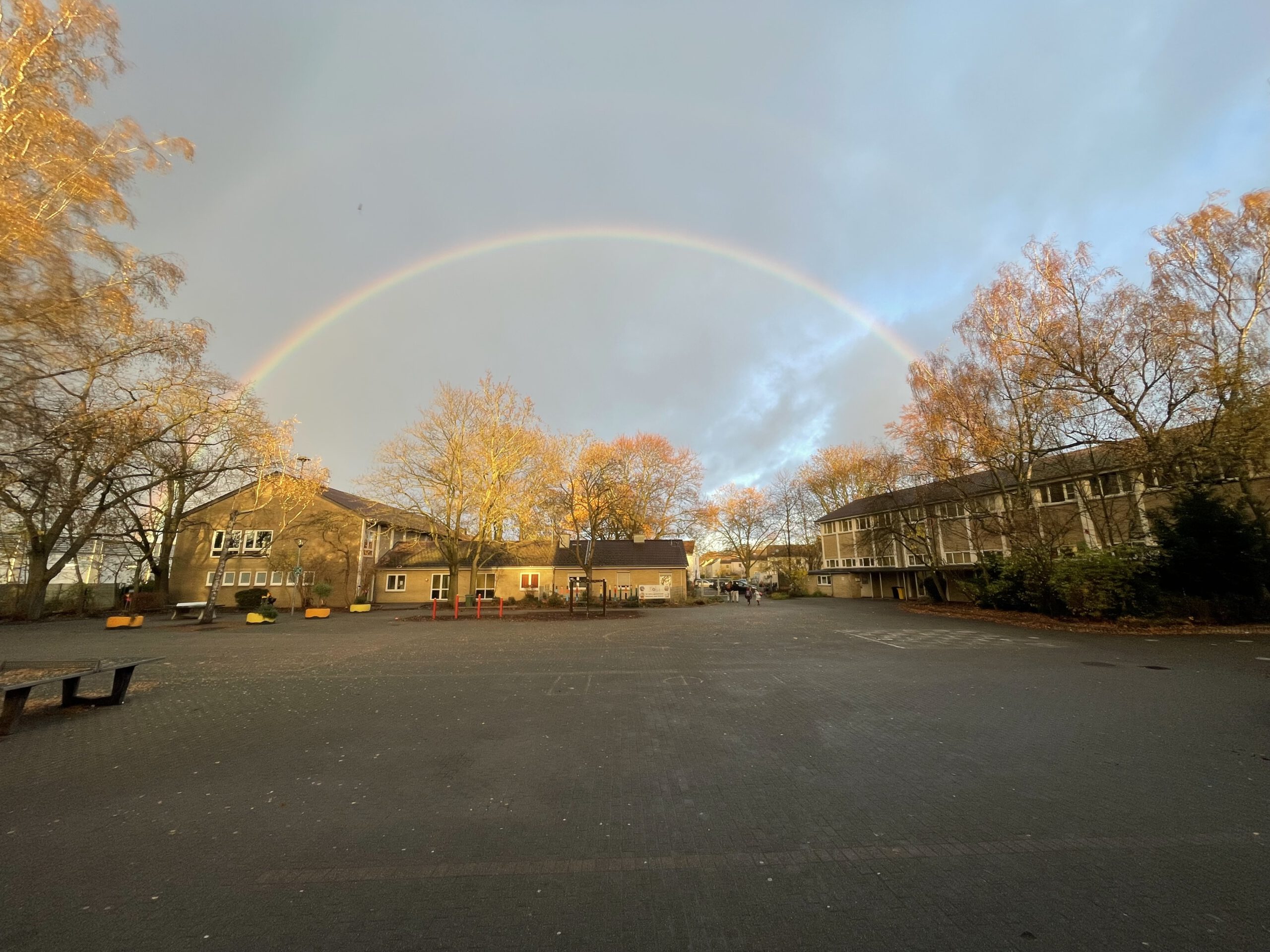 Manchmal zeigt sich die Welt genau im richtigen Moment von ihrer schönsten Seite. Heute spannte sich ein wunderschöner Regenbogen über unseren Schulhof – so klar und farbenfroh, dass man kurz stehen bleiben muss, um ihn einfach nur anzuschauen.